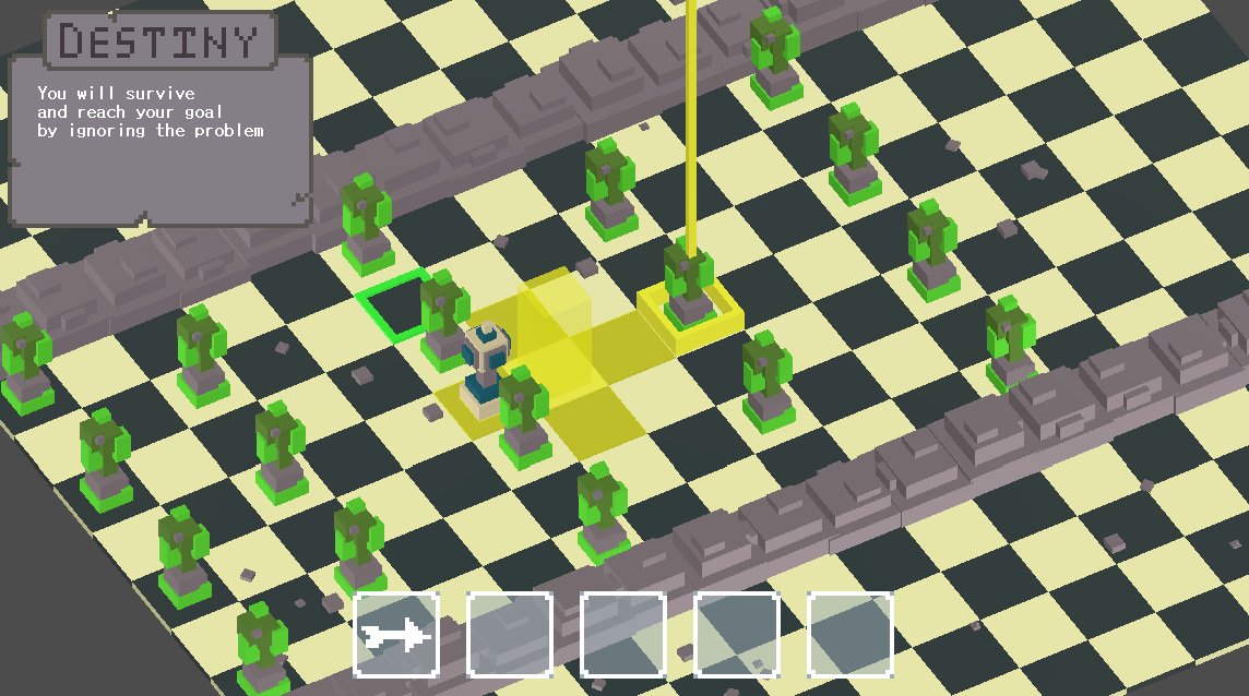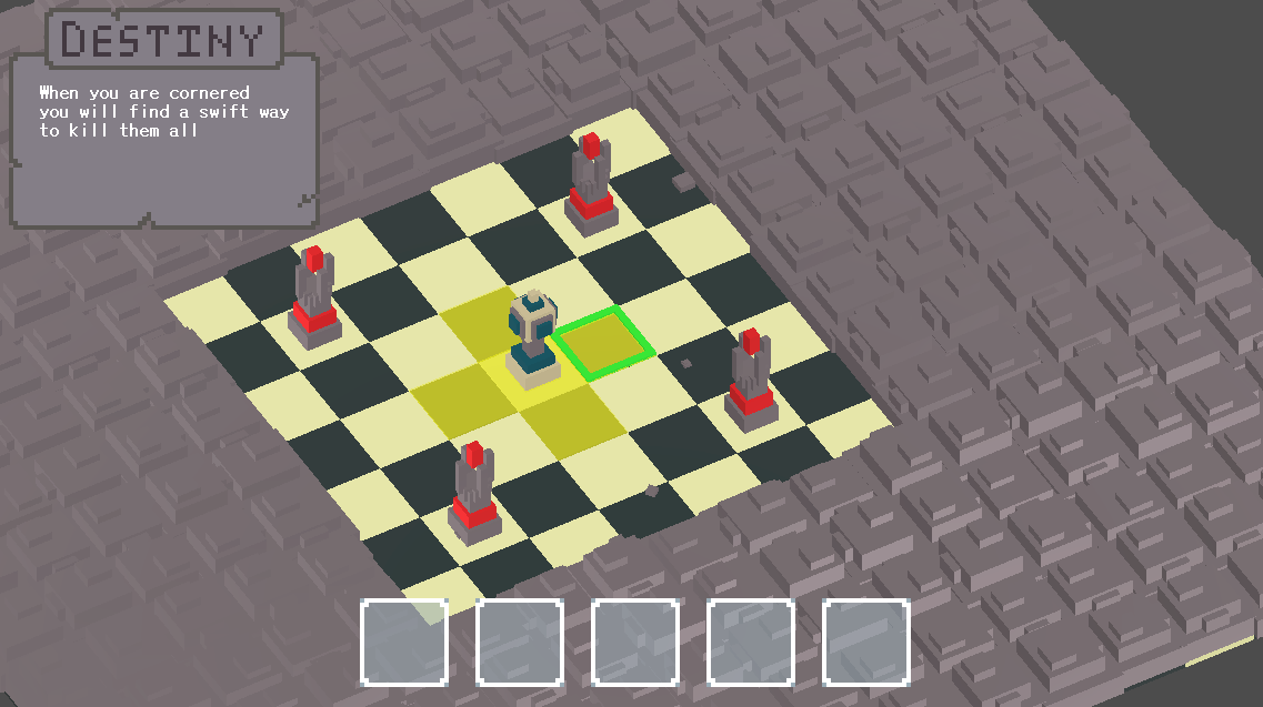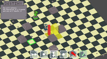 To play the game, the player inputs a sequence of 5 moves every round. There are several options, such as idling, moving and attacking. Enemies may also be present in the stage, however they will also have a set of moves they will make per round that are executed in tandem with the player. It is up to the player to have the "foresight" to predict and plan ahead in order to fulfil their destiny.